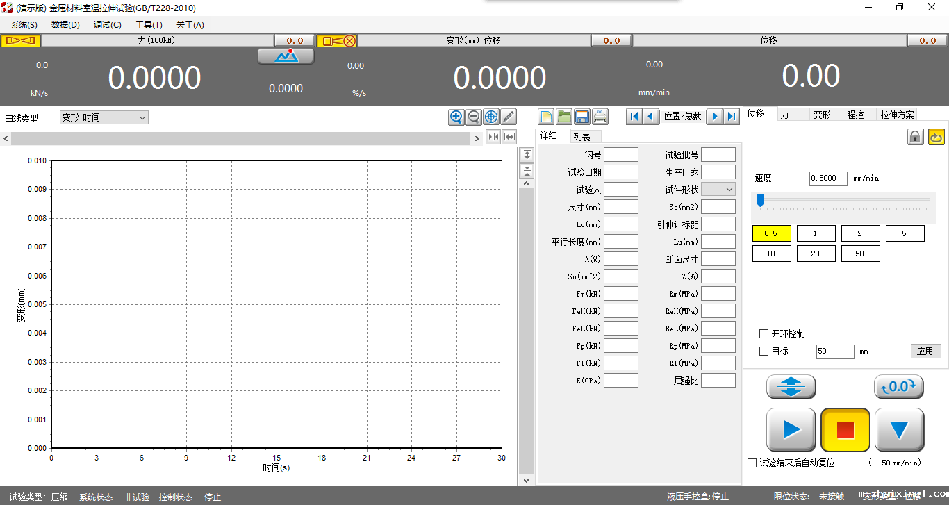 l Ö÷½çÃæ¼¯¶à¹¦ÄÜÓÚÒ»Ì壬³ÌÐòÖ÷½çÃæ°üÀ¨£ºÏµÍ³²Ëµ¥Çø¡¢¹¤¾ßÀ¸Çø¡¢Ê¾ÖµÏÔÊ¾Ãæ°å¡¢ËÙ¶ÈÏÔÊ¾Ãæ°å¡¢ÊÔÑé²ÎÊýÇø¡¢ÊÔÑé¹ý³ÌÇø¡¢¶àͼÇúÏßÇø¡¢½á¹û´¦ÀíÇø¡¢ÊÔÑéÐÅÏ¢Çø¡£