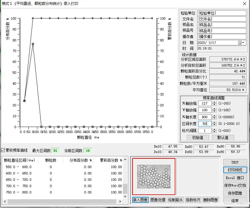³¤Öá¡¢¶ÌÖá¡¢Ö±¾¶£¬ÒÔ¼°¿ÅÁ£×ÜÃæ»ý¡¢¿ÅÁ£Ãæ»ý°Ù·Ö±È¡¢¿ÅÁ£×ÜÊý¡¢Æ½¾ùÖ±¾¶¡¢¿ÅÁ£Êý/ƽ·½ºÁÃס¢DN10¡¢DN50¡¢DN90ÒÔ¼°DS10¡¢DS50¡¢DS90µÈ²ÎÊý£»Í³¼Æ¿ÅÁ£Ö±¾¶Çø¼äµÄ¿ÅÁ£Êý¡¢·Ö²¼°Ù·ÖÊý¡¢ÀÛ»ý°Ù·ÖÊý£¬»æÖÆÍ³¼ÆÍ¼¡£
