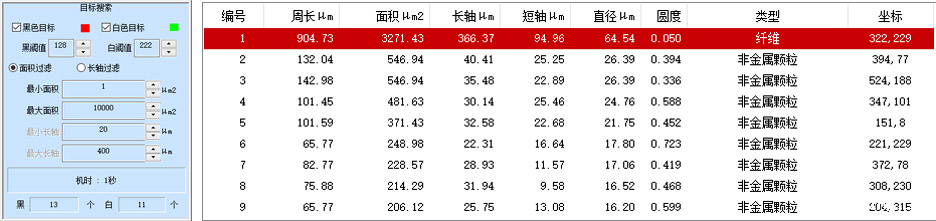 ÅäºÏµç¶¯Æ½Ì¨¿ÉÒÔʵÏÖÇå½à¶ÈÂËĤµÄ×Ô¶¯É¨ÃèºÍÆ´½Ó£¬×Ô¶¯Ê¶±ð³ö ½ðÊô¡¢·Ç½ðÊô¡¢ÏËάµÈ¿ÅÁ£Àà±ð£»×Ô¶¯¼ÆËã³öÿ¸ö¿ÅÁ£µÄ³¤Öá¡¢¶ÌÖá¡¢Ãæ»ý¡¢¿í¸ß±ÈµÈÐÎ̬²ÎÊý¡£